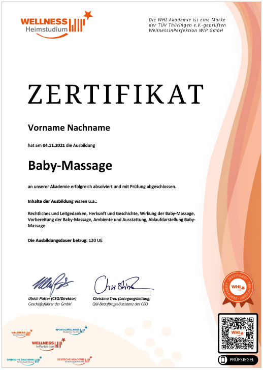 Sie können die Online Babymassage-Ausbildung jederzeit beginnen – an jedem Tag, der Ihnen passt! Sie haben 12 Monate Zeit, um die Inhalte in Ihrem eigenen Tempo zu absolvieren. Es gibt also keinen Zeitdruck! Wenn Sie alle Lektionen absolviert haben, können Sie sich für die Online Abschlussprüfung anmelden. Nach Bestehen der Abschlussprüfung beantragen Sie Ihre beiden Digital-Zertifikate (deutsch und englisch). Das Deutsche Zertifikat und das Englische Certificate (PWA - Professional Wellness Award) sind direkt als Download (PDFs) verfügbar und im Preis schon inkludiert. Für einmalige 49,95 EUR können die beiden dazugehörigen physischen Zertifikate auf echtem Kartondruck (signiert) erworben werden - diese werden dann direkt nach Zahlungseingang via DHL an Sie ausgeliefert.
