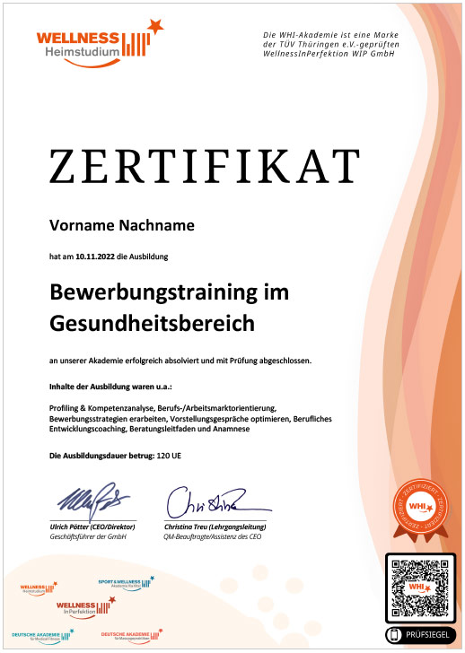 Sie können die Bewerbungstraining Online Ausbildung jederzeit starten – es gibt keine festen Termine. Sie haben insgesamt 12 Monate Zeit, um die Ausbildung in Ihrem eigenen Tempo abzuschließen. Wenn Sie alle Lektionen absolviert haben, können Sie sich für die Online Abschlussprüfung anmelden. Nach Bestehen der Abschlussprüfung beantragen Sie Ihre beiden Digital-Zertifikate (deutsch und englisch). Das Deutsche Zertifikat und das Englische Certificate (PWA - Professional Wellness Award) sind direkt als Download (PDFs) verfügbar und im Preis schon inkludiert. Für einmalige 49,95 EUR können die beiden dazugehörigen physischen Zertifikate auf echtem Kartondruck (signiert) erworben werden - diese werden dann direkt nach Zahlungseingang via DHL an Sie ausgeliefert.