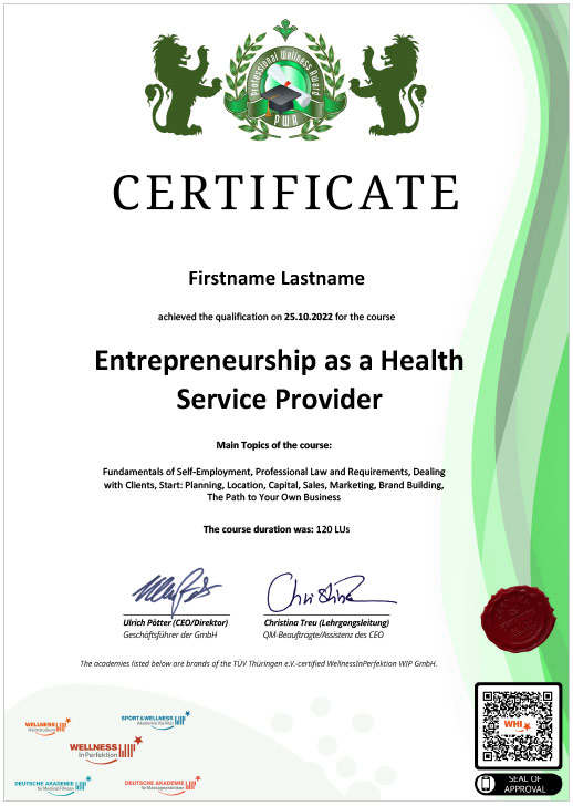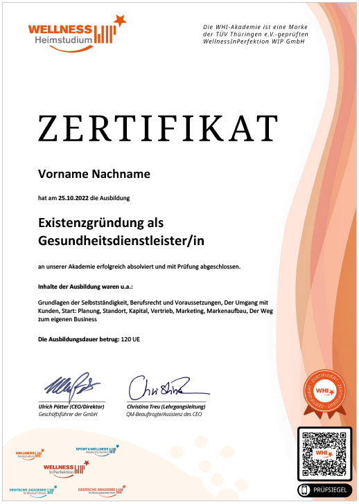 Sie können die Online-Ausbildung zur Existenzgründung jederzeit beginnen, wann es Ihnen passt! Sie haben insgesamt 12 Monate Zeit, die Ausbildung in Ihrem eigenen Tempo abzuschließen. Lernen Sie, wann immer es Ihnen möglich ist – ganz stressfrei! Wenn Sie alle Lektionen absolviert haben, können Sie sich für die Online Abschlussprüfung anmelden. Nach Bestehen der Abschlussprüfung beantragen Sie Ihre beiden Digital-Zertifikate (deutsch und englisch). Das Deutsche Zertifikat und das Englische Certificate (PWA - Professional Wellness Award) sind direkt als Download (PDFs) verfügbar und im Preis schon inkludiert. Für einmalige 49,95 EUR können die beiden dazugehörigen physischen Zertifikate auf echtem Kartondruck (signiert) erworben werden - diese werden dann direkt nach Zahlungseingang via DHL an Sie ausgeliefert.