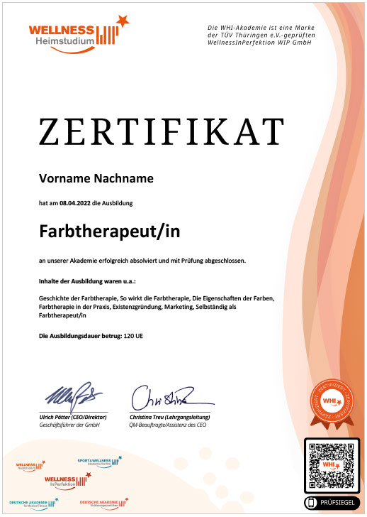Die Farbtherapeut/in Online-Ausbildung können Sie jederzeit beginnen, wann es Ihnen passt. Sie haben insgesamt 12 Monate Zeit, um den Kurs in Ihrem eigenen Tempo abzuschließen. Dies macht das Lernen besonders stressfrei! Nach Bestehen der Abschlussprüfung beantragen Sie Ihre beiden Digital-Zertifikate (deutsch und englisch). Das Deutsche Zertifikat und das Englische Certificate (PWA - Professional Wellness Award) sind direkt als Download (PDFs) verfügbar und im Preis schon inkludiert. Für einmalige 49,95 EUR können die beiden dazugehörigen physischen Zertifikate auf echtem Kartondruck (signiert) erworben werden - diese werden dann direkt nach Zahlungseingang via DHL an Sie ausgeliefert.