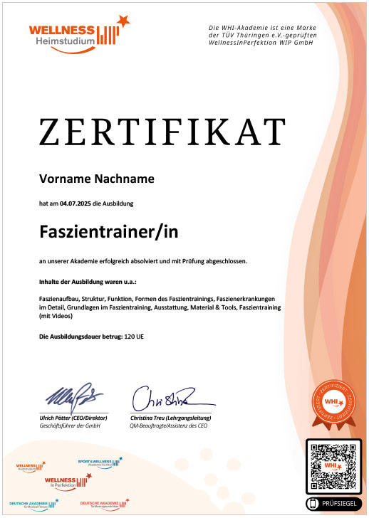 Sie können die Online-Ausbildung zum/zur Faszientrainer/in jederzeit starten, wann immer es für Sie passt. Sie haben insgesamt 12 Monate Zeit, um den Kurs in Ihrem eigenen Tempo abzuschließen. Das Lernen ist völlig stressfrei! Nach Bestehen der Abschlussprüfung beantragen Sie Ihre beiden Digital-Zertifikate (deutsch und englisch). Das Deutsche Zertifikat und das Englische Certificate (PWA - Professional Wellness Award) sind direkt als Download (PDFs) verfügbar und im Preis schon inkludiert. Für einmalige 49,95 EUR können die beiden dazugehörigen physischen Zertifikate auf echtem Kartondruck (signiert) erworben werden - diese werden dann direkt nach Zahlungseingang via DHL an Sie ausgeliefert.