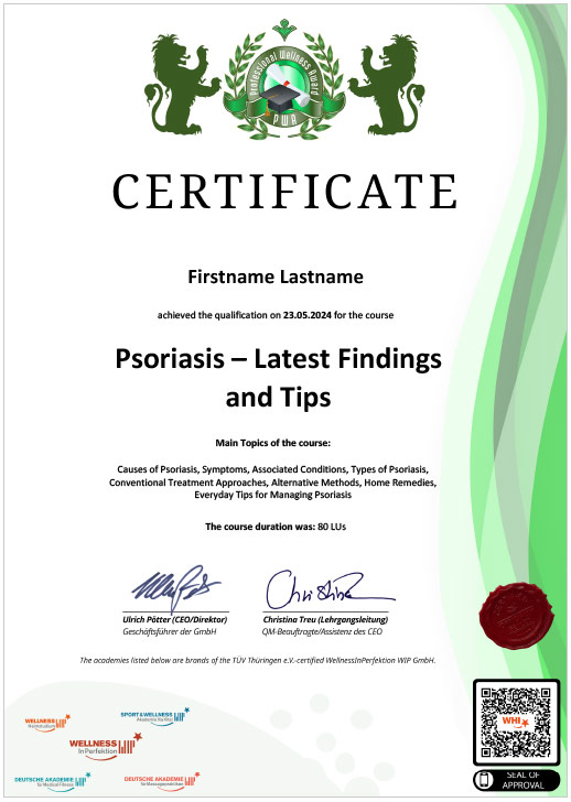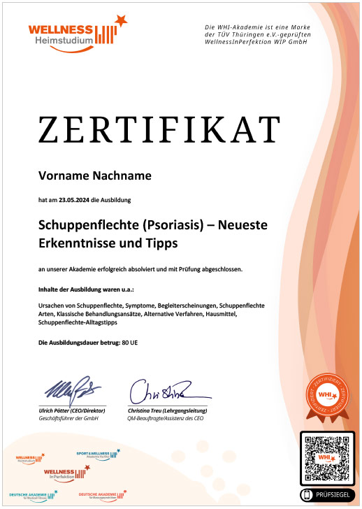 Wir haben unseren Schuppenflechte / Psoriasis Online-Lehrgang so entwickelt, dass er ein Höchstmaß an Qualität bietet und alle Teilnehmer optimal auf die praktischen Herausforderungen des Themas vorbereitet. Daher erhält jeder Absolvent ein hochwertiges digitales Zertifikat als Nachweis für die abgeschlossenen Lerninhalte und die bestandene Prüfung. Das Zertifikat kann nach Vollendung des Lehrgangs direkt im Account heruntergeladen werden (Download) und/oder alternativ via Knopfdruck per E-Mail abgerufen werden.